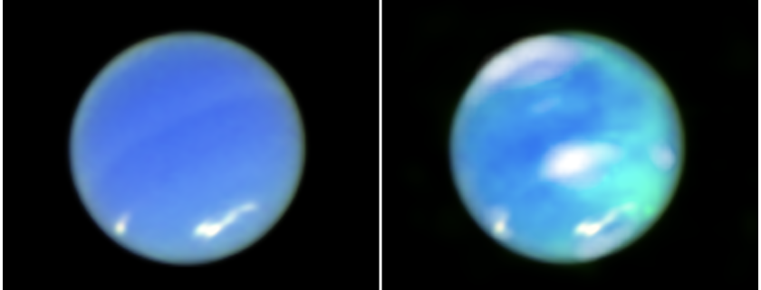 The image is the first Neptune auroral observation since Voyager, and the starting point for our observations. At the left, an enhanced-color image of Neptune from NASA’s Hubble Space Telescope. At the right, that image is combined with data from NASA’s James Webb Space Telescope.